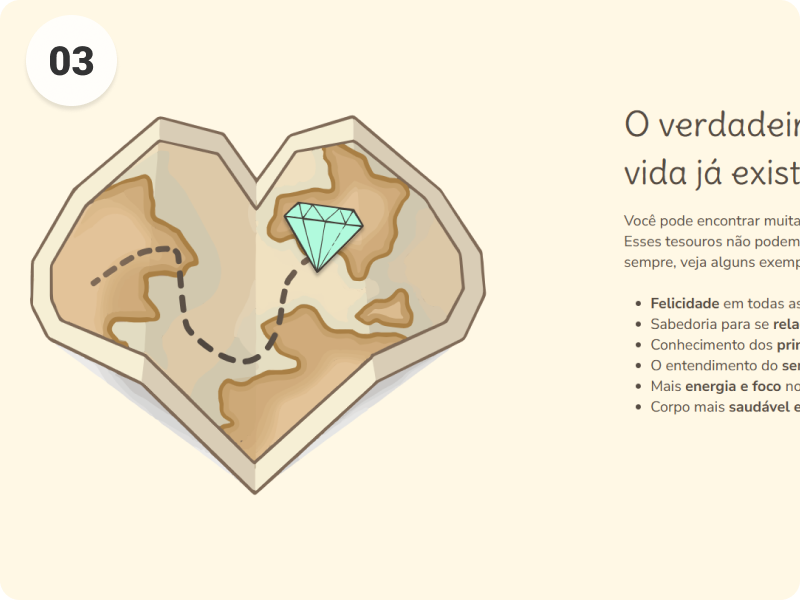Sessões com storytelling visual: Mapa em forma de coração → o tesouro está dentro. / Depoimentos em linha do tempo → quanto mais se pratica, maiores os benefícios.